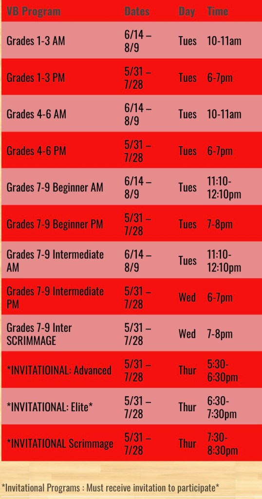 Volleyball Clinics: $170; Volleyball Scrimmages: $125